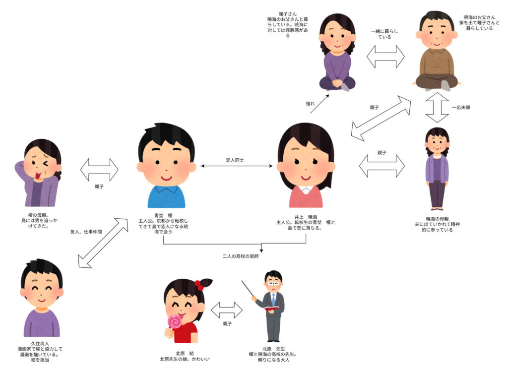 瀬戸内の島で暮らしていた井上暁海。母親と二人で島内で暮らしてるが、父親が違う女と出ていってしまってから母親は精神的に不安定な状況になっています。一方、京都から引っ越してきた青埜櫂。彼も母親と二人暮らしをしていて、母親は島で飲み屋を経営しています。櫂の母親は男がいないと気持ちが安定しない女性で、島にも男の跡を追ってやってきています。