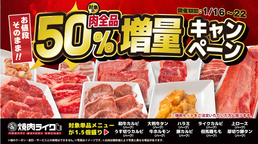 焼き肉ライクからお得なキャンペーン。焼き肉セットをご注文したお客様で追加で単品メニューを注文するとお値段そのままでお肉の量がなんと1.5倍!!